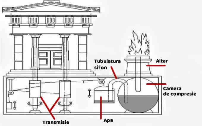 Heron Alexandrinus era cunoscut în acea perioadă drept Heron Michanikos (Mecanicul). Pentru a realiza prima ușă automată, din istoria omenirii, acesta nu a avut nevoie decât de foc, apă şi un ingenios sistem de pârghii. Era suficient ca la un moment bine determinat, cineva să aprindă un foc într-un altar anume construit în faţa templului. După câteva ore, aerul încălzit în altar era dirijat către un vas uriaş plin cu apă, forţând apa să curgă într-un al treilea vas. Acesta din urmă, odată umplut cu apă, începea să coboare într-o cameră subterană, determinând, cu ajutorul unui simplu şi inedit sistem de scripeţi deschiderea uşilor templului exact în momentul în care credincioşii soseau la ritualurile zilnice.