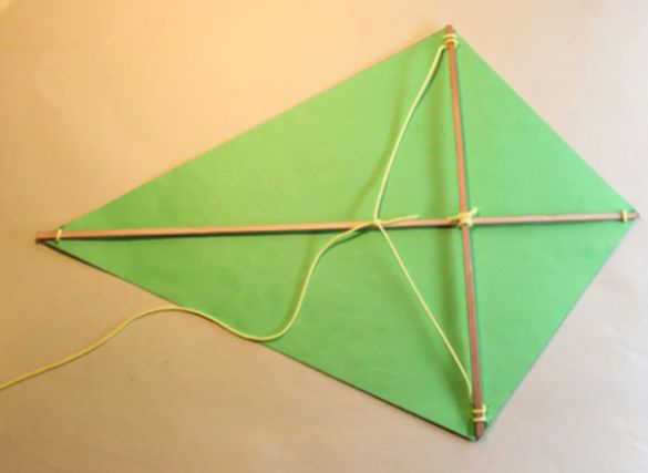 3. În pasul următor se ia o bucată de ață și se leagă de marginile aripilor zmeului. Pentru a fi mai preciși, ața se leagă de cadrul de bețe. Apoi, cele două fire sunt legate împreună de către o sfoară mai lungă exact ca în imaginea de mai jos.
